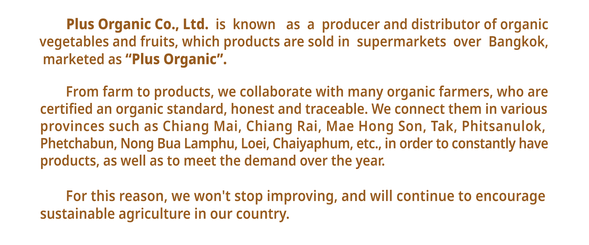 Plus Organic Co., Ltd. is known as a producer and distributor of organic vegetables and fruits, which products are sold in supermarkets over Bangkok, marketed as “Plus Organic”.